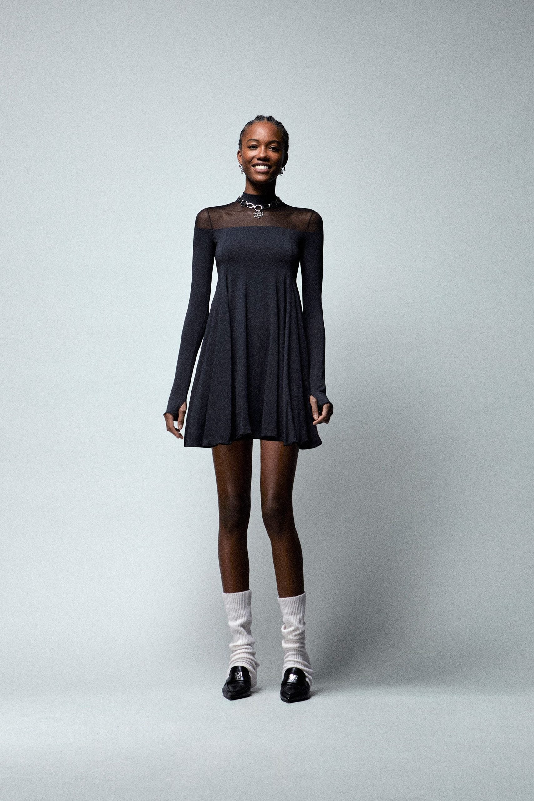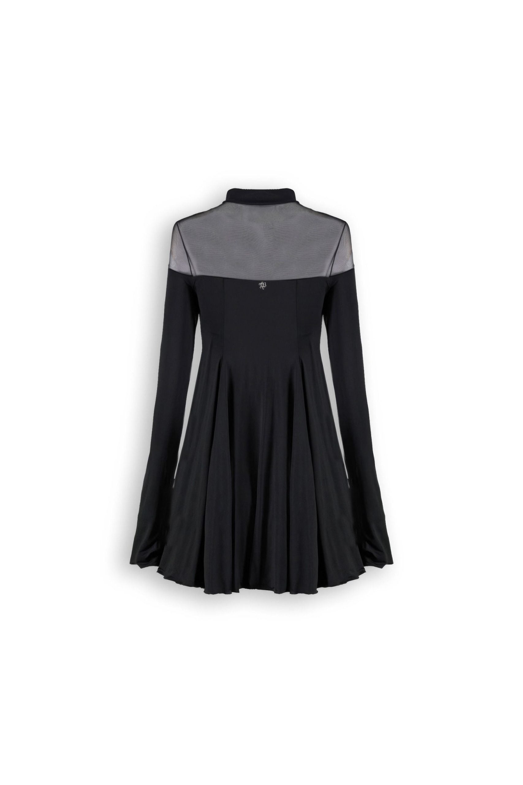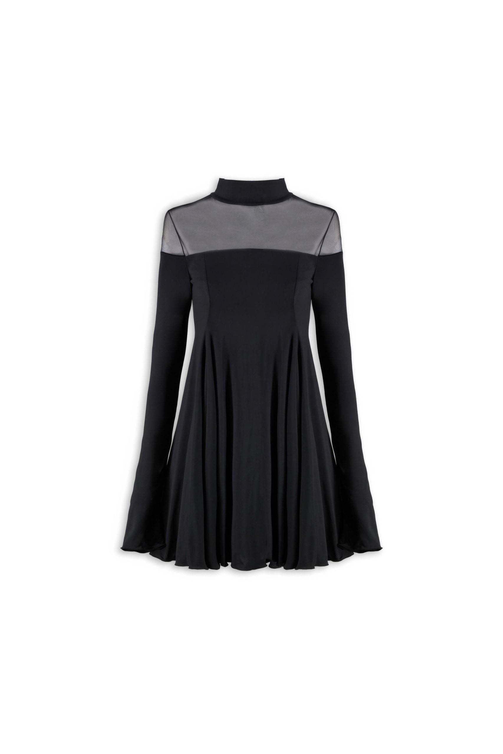 Abito mini con gonna a ruota in lycra. Modello a collo alto e maniche lunghe. La gonna a ruota aggiunge movimento al look, mentre le trasparenze sulle spalle donano un effetto seducente al capo.